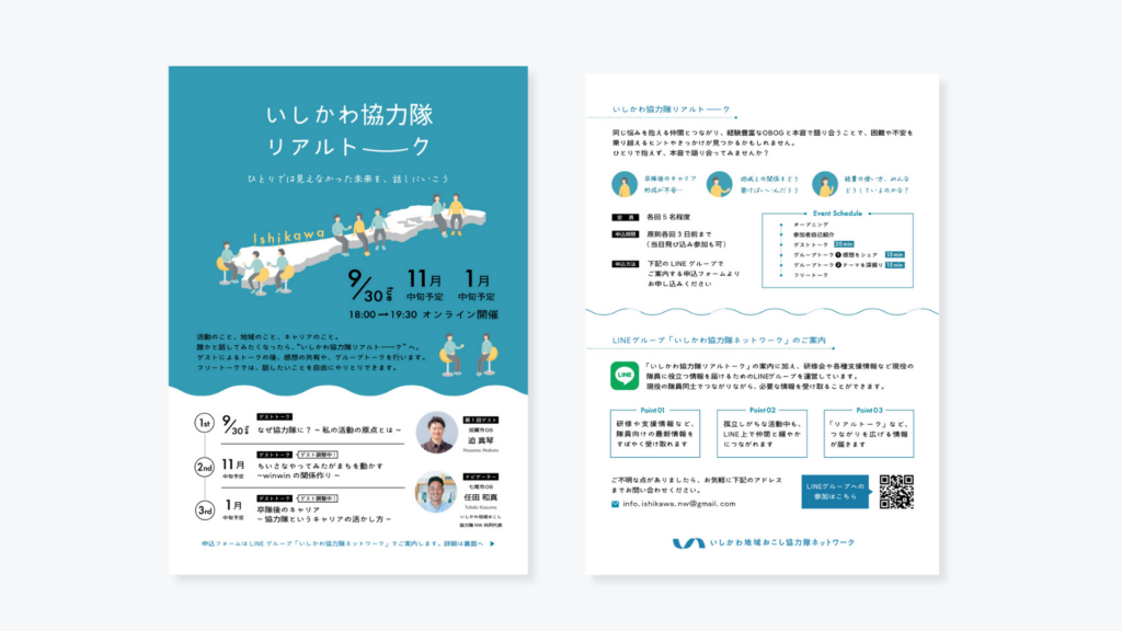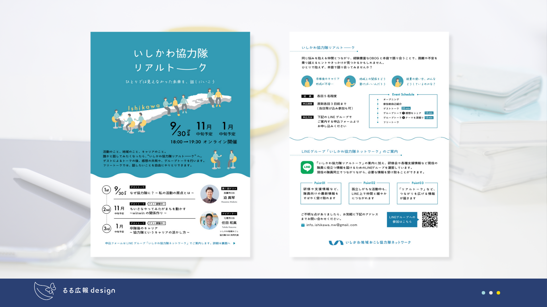 いしかわ地域おこし協力隊ネットワーク様より、現役の地域おこし協力隊員を対象としたオンラインイベントのチラシ制作をご依頼いただきました。