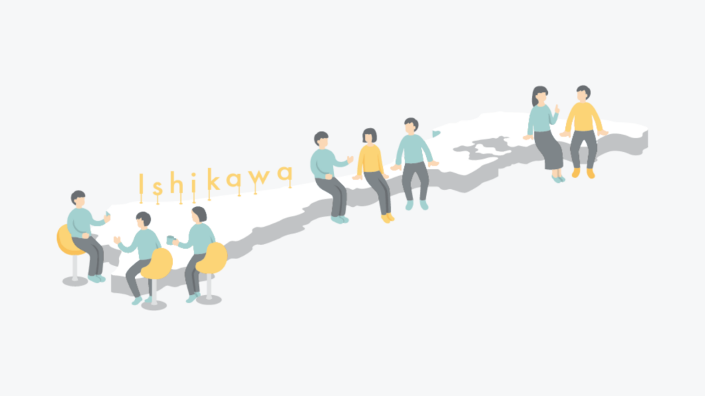 その魅力を直感的に伝えるため、石川県の形を模したテーブルを囲み、リラックスして会話を楽しむ人々の様子を描いたイラストを制作しました。