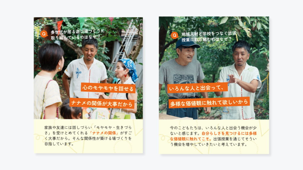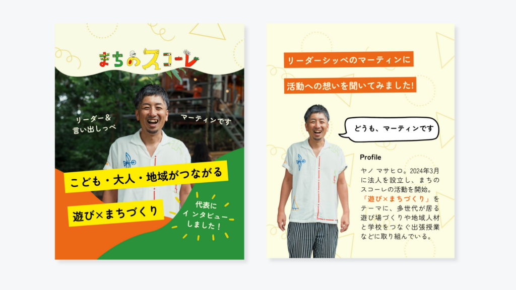神奈川県茅ヶ崎市・藤沢市を中心に活動する非営利型一般社団法人 遊びでまちづくりする準備室様より、多世代の交流遊び場づくりや出張授業などを行う「まちのスコーレ」の取組について、代表へのインタビューおよびInstagram投稿用画像の制作をご依頼いただきました。
